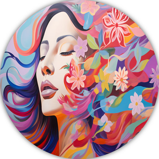 Vrouwelijke schoonheid in een bloemenzee aluminium muurcirkel