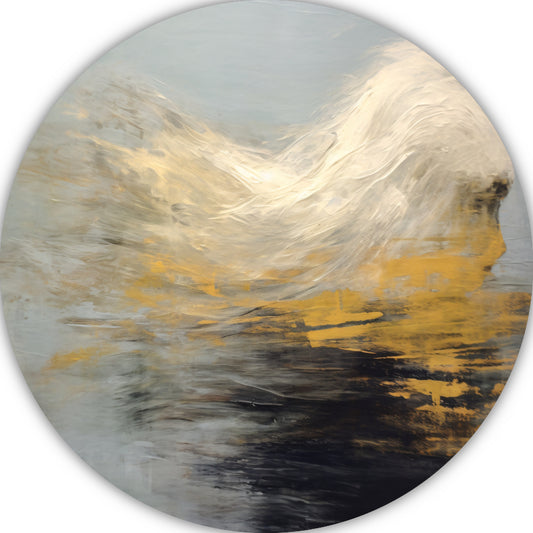 Abstract schilderij in blauw, wit en goud aluminium muurcirkel