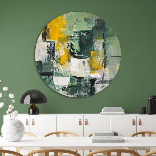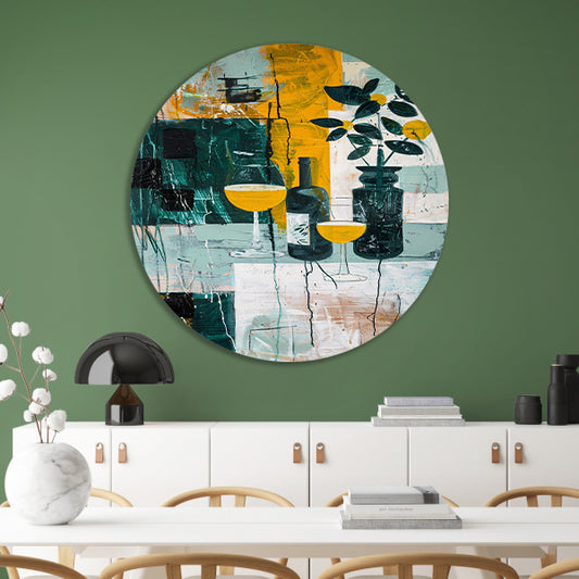 Abstracte stilleven met kleurrijke fles en glazen aluminium muurcirkel