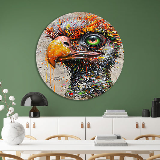 Kleurrijke surrealistische vogel met grote oogdetails aluminium muurcirkel