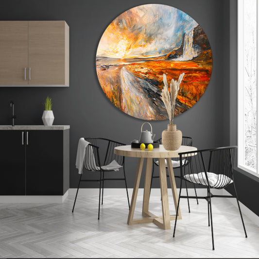 Impressionistische waterval bij zonsondergang schilderij aluminium muurcirkel