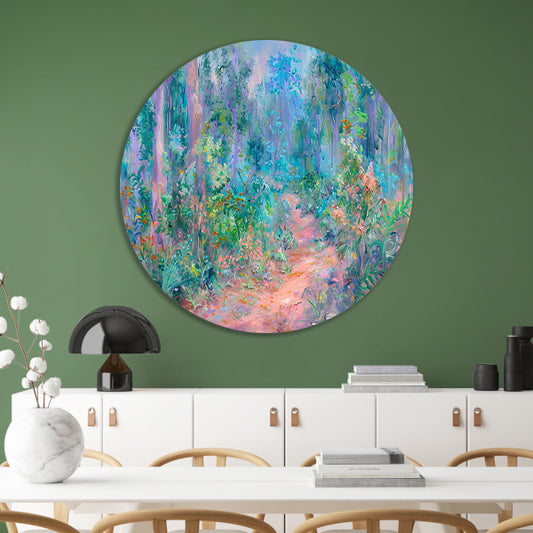 Betoverend schilderij van kleurrijk boslandschap aluminium muurcirkel