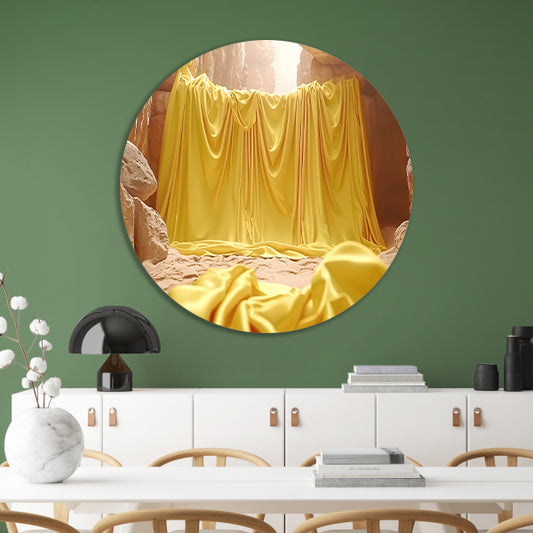 Gele doek in natuurlijke grot omgeving aluminium muurcirkel
