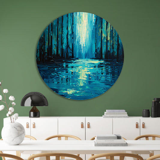 Surrealistisch boslandschap in levendige kleuren aluminium muurcirkel