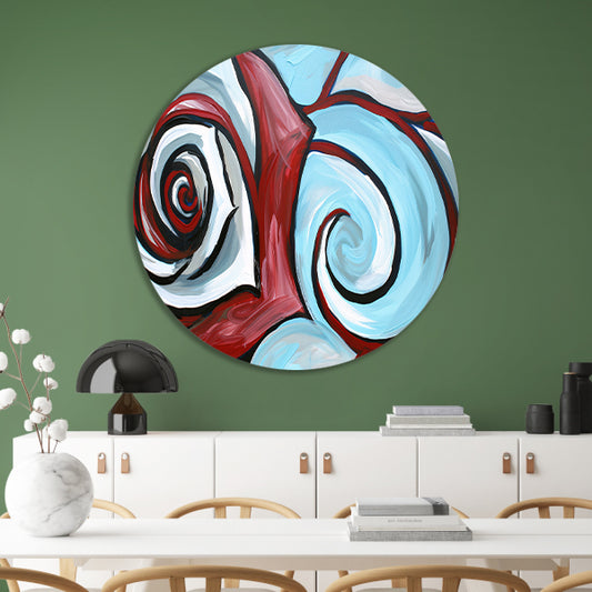 Kleurrijk abstract schilderij met dynamische vormen aluminium muurcirkel