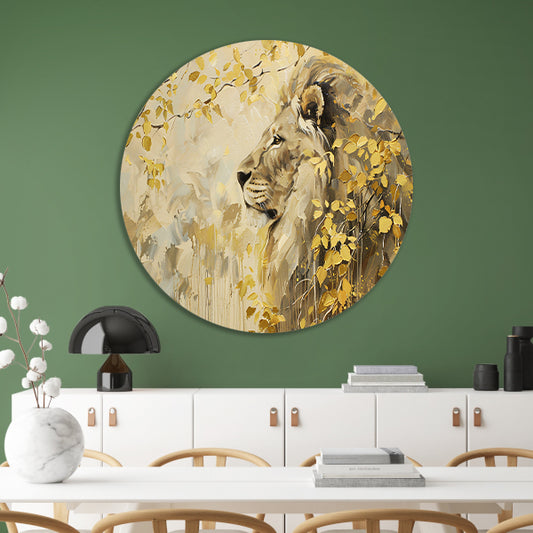 Moderne schilderij van een leeuw en bladeren aluminium muurcirkel