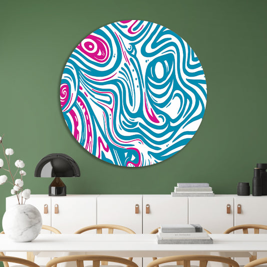 Dynamisch abstract lijnenspel in blauw en roze aluminium muurcirkel