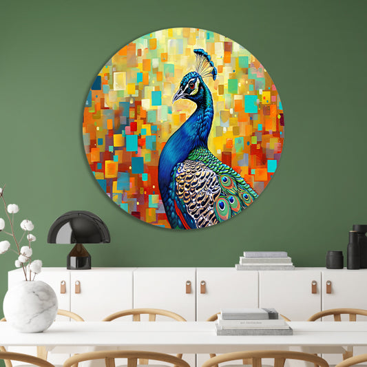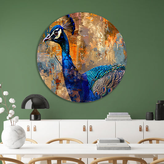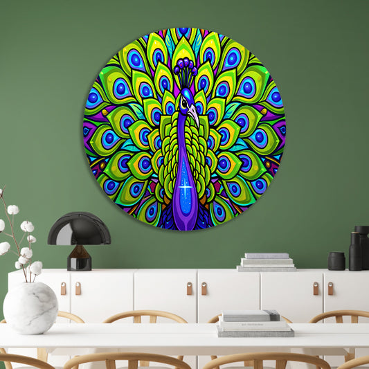 Abstracte pauw kunst met dynamische kleuren aluminium muurcirkel