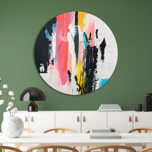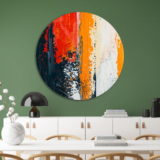 Dynamisch abstract schilderij met expressieve kleuren aluminium muurcirkel