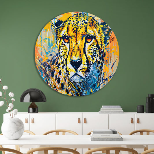 Dynamisch en kleurrijk schilderij van een cheeta aluminium muurcirkel