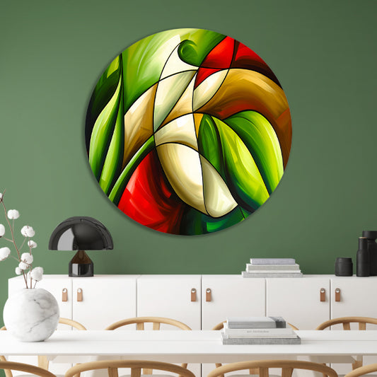 Dynamisch abstract schilderij met levendige kleuren aluminium muurcirkel