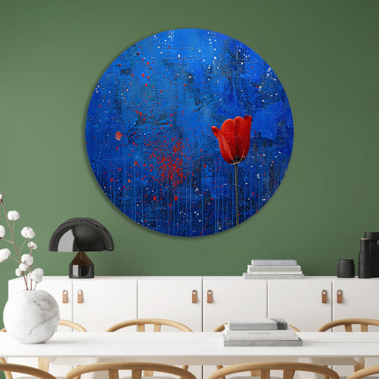 Abstracte tulp tegen dynamische blauwe achtergrond aluminium muurcirkel