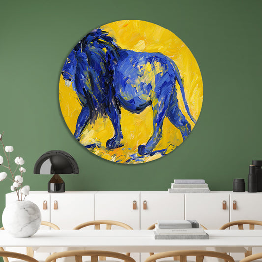 Schilderij van een abstracte blauwe leeuw aluminium muurcirkel
