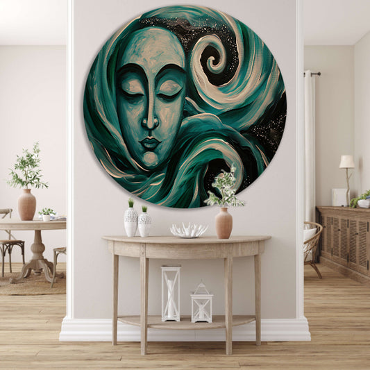 Abstract boeddha schilderij met rijke textuur aluminium muurcirkel