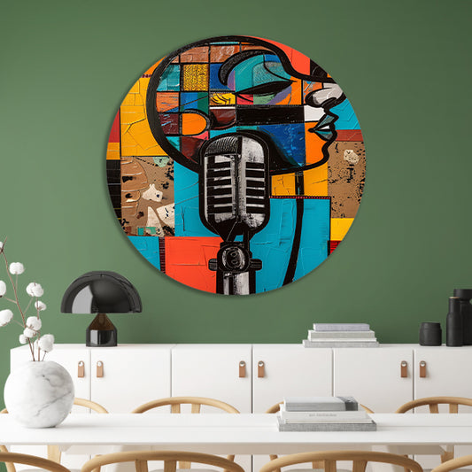 Abstract portret met microfoon in felle kleuren aluminium muurcirkel