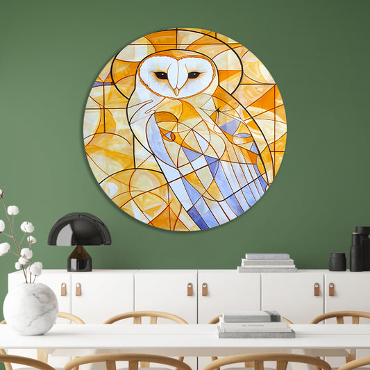 Geometrische uil schilderij in warme kleuren aluminium muurcirkel