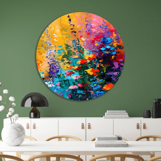 Kleurrijk abstract bloemenweide schilderij aluminium muurcirkel