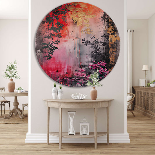 Abstracte bloemenweide in warme tinten aluminium muurcirkel