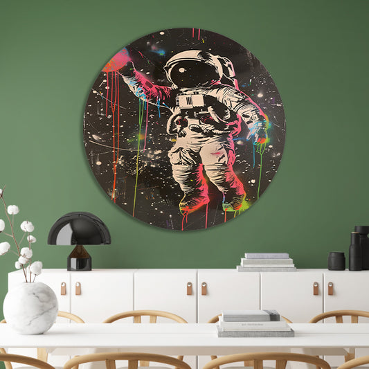 Astronaut Ontmoet Levendige Kleuren in de Ruimte aluminium muurcirkel