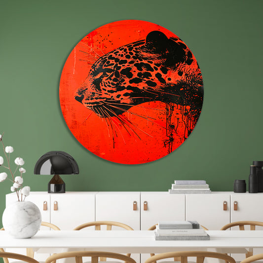 Dynamisch jaguar kunstwerk op rode achtergrond aluminium muurcirkel