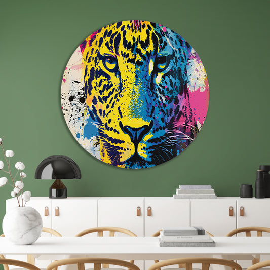Kleurrijke popart schilderij van een luipaard aluminium muurcirkel