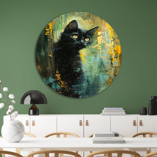 Elegante zwarte kat met dynamische achtergrond aluminium muurcirkel