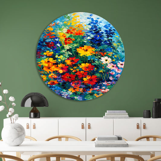 Kleurrijke abstracte bloemenveld schilderij aluminium muurcirkel