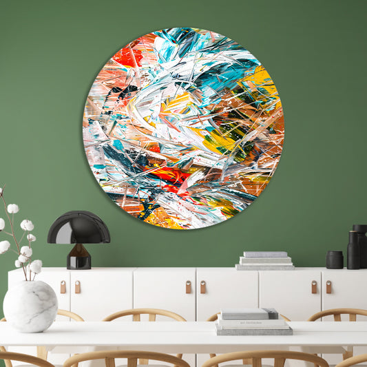 Dynamisch abstract schilderij met kleurrijke lijnen aluminium muurcirkel