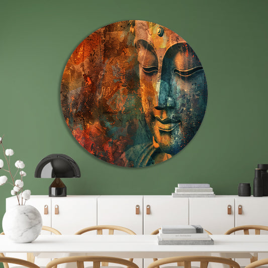 Mysterieus Boeddha portret met kleurrijke texturen aluminium muurcirkel