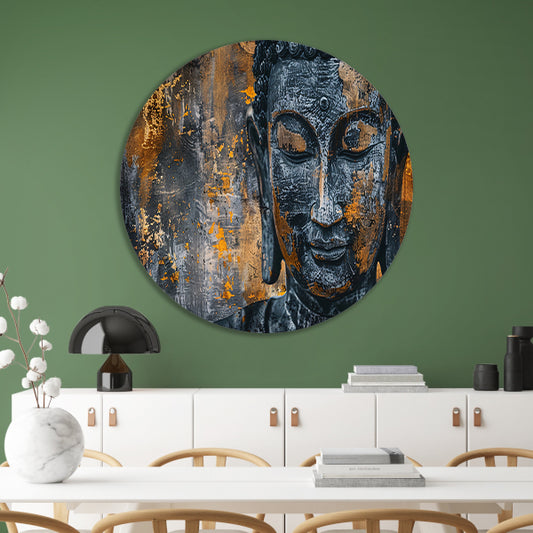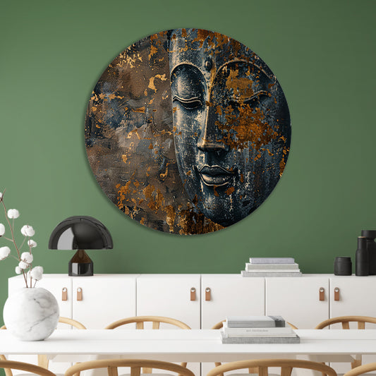Mysterieus Boeddha portret in rustieke stijl aluminium muurcirkel