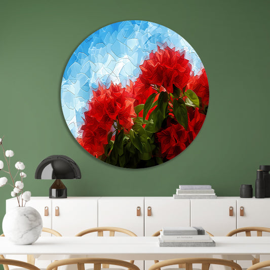 Abstracte rode bloemen tegen blauwe lucht aluminium muurcirkel