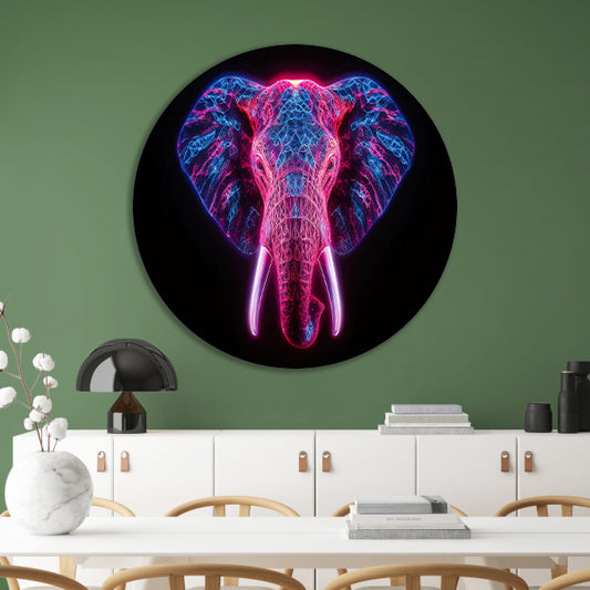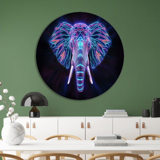 Neon olifant in futuristische abstracte kunst aluminium muurcirkel