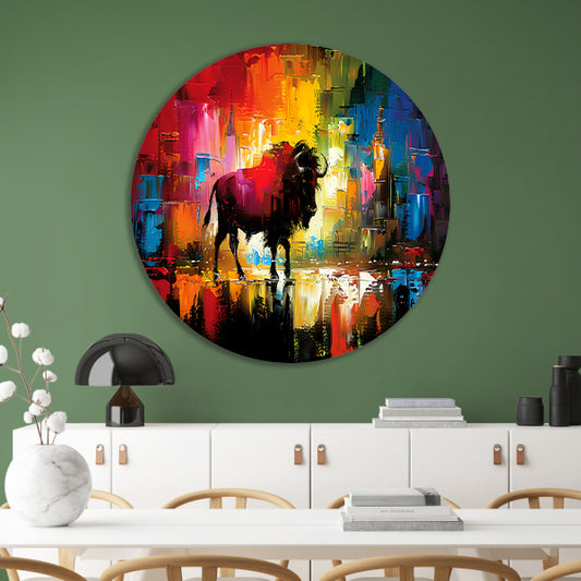 Abstracte schilderij van bison in kleurrijke stad aluminium muurcirkel