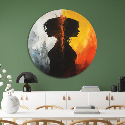 Silhouet van een vrouw tussen twee werelden aluminium muurcirkel