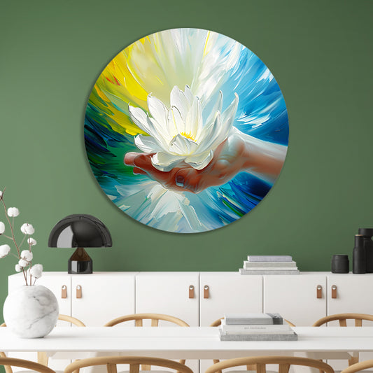 Abstracte kleurrijke bloem in een hand aluminium muurcirkel
