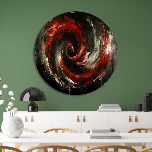 Dynamische abstracte werveling in rood en zwart aluminium muurcirkel