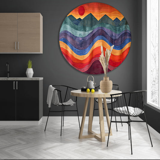 Kleurrijk abstract landschap met bergen en zon aluminium muurcirkel
