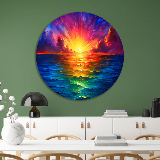 Kleurrijke zonsondergang boven kalm water schilderij aluminium muurcirkel