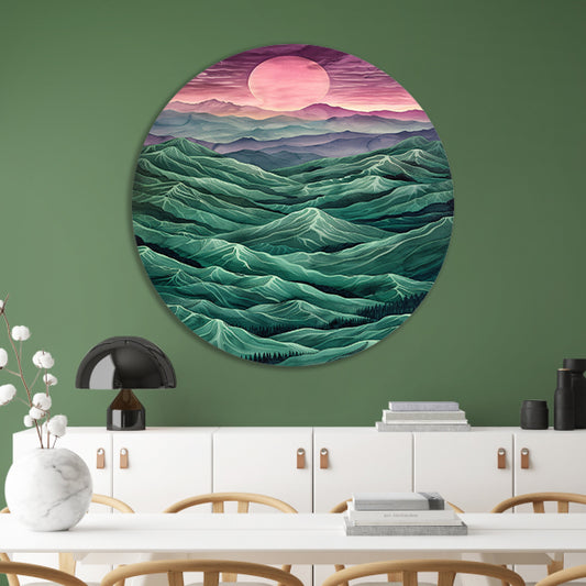 Surrealistisch landschap met bergen en zon aluminium muurcirkel