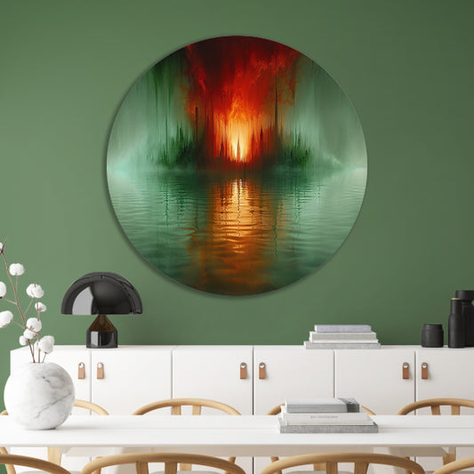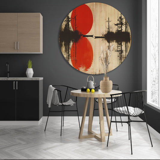 Abstracte rode zon boven water met bomen aluminium muurcirkel