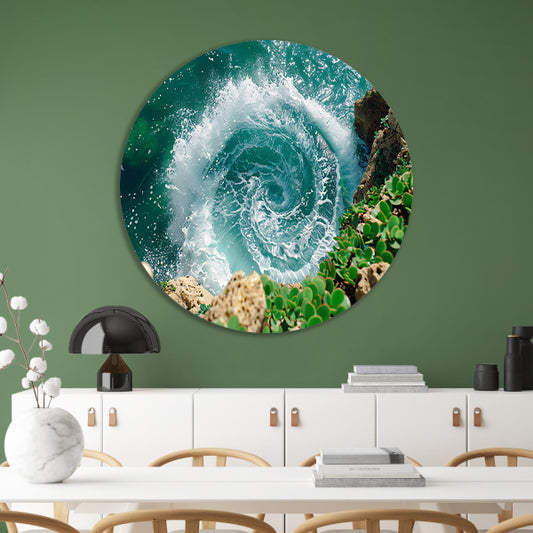 Abstracte waterwerveling bij rotsachtige kust aluminium muurcirkel