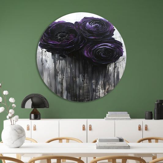Grote Abstracte Bloemen in Zwart en Paars aluminium muurcirkel