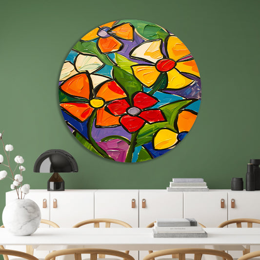 Kleurrijke en abstracte bloemenschilderij met dynamische uitstraling aluminium muurcirkel