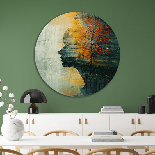 Vrouw met boom in herfstkleuren aluminium muurcirkel