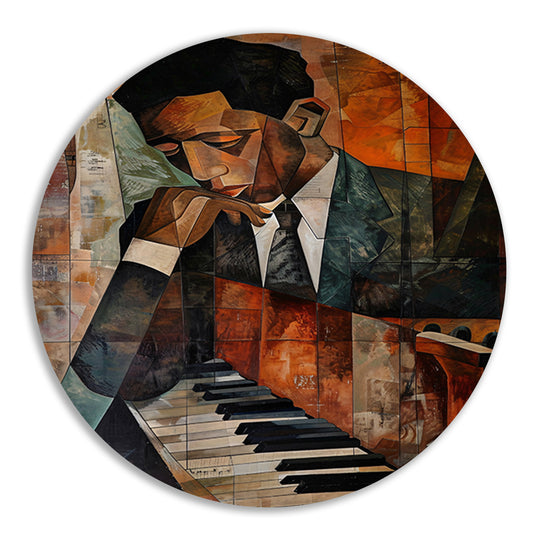 Kubistische piano en portret van muzikant aluminium muurcirkel