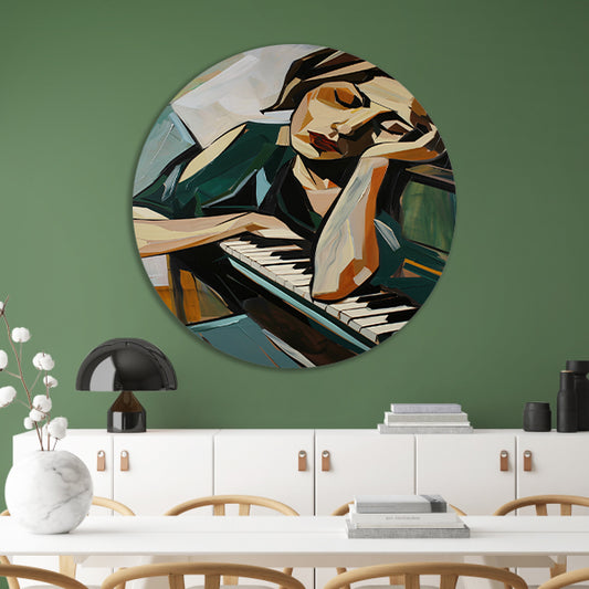 Vrouw verdiept in muziek bij piano aluminium muurcirkel