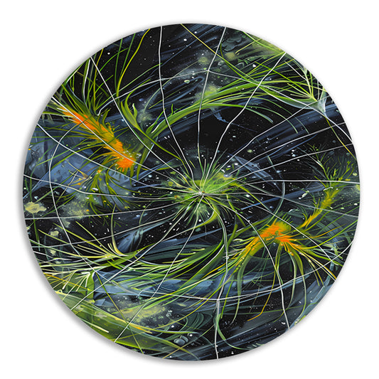 Abstracte Vogels in Kleurrijke Chaos aluminium muurcirkel