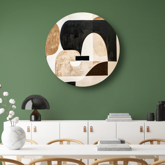 Abstracte Harmonie in Zwart, Beige en Goud aluminium muurcirkel