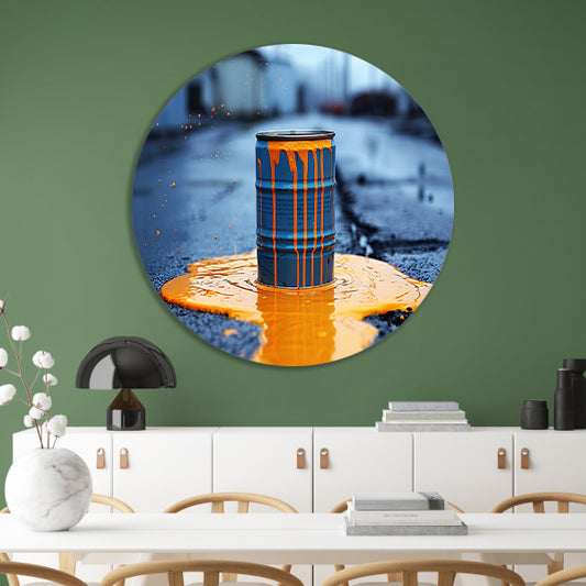 Blauw Vat in Oranje Verf aluminium muurcirkel