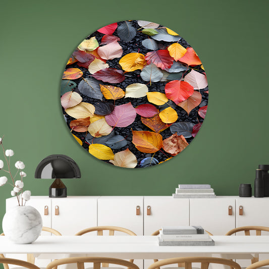 Kleurrijk herfstbladeren op donkere straat aluminium muurcirkel